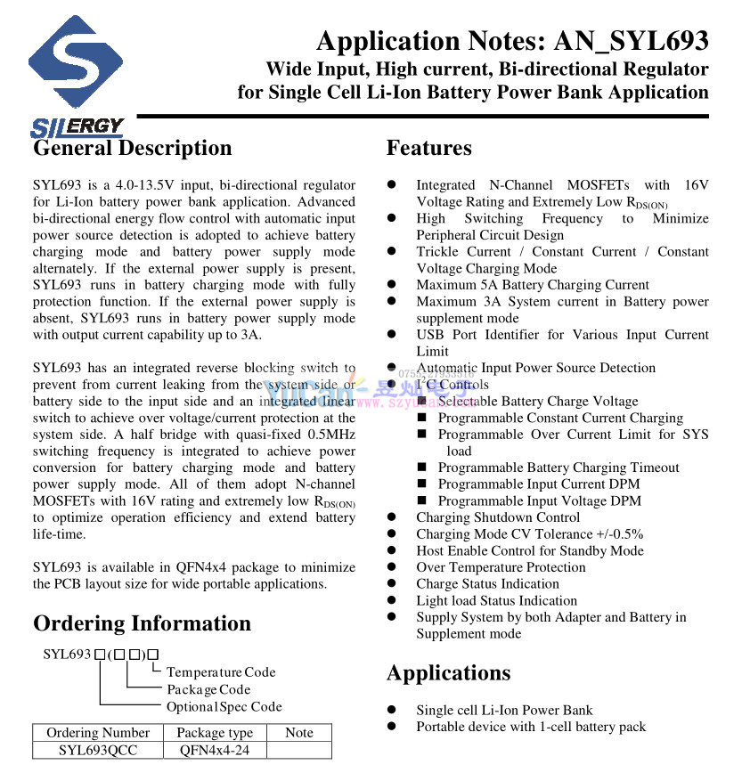 SYL693 4-13V 5A充 3A放 集DPM 輸出限流 EN控制 I2C 及OTG功能的雙燈指示移動電源IC